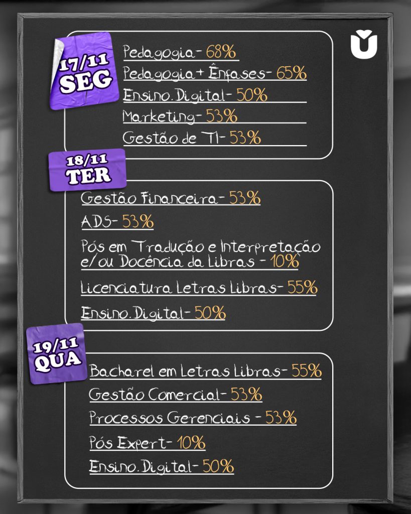 Em cada um dos três dias haverá uma seleção específica de cursos com os maiores descontos do ano, podendo chegar a até 68% OFF.
